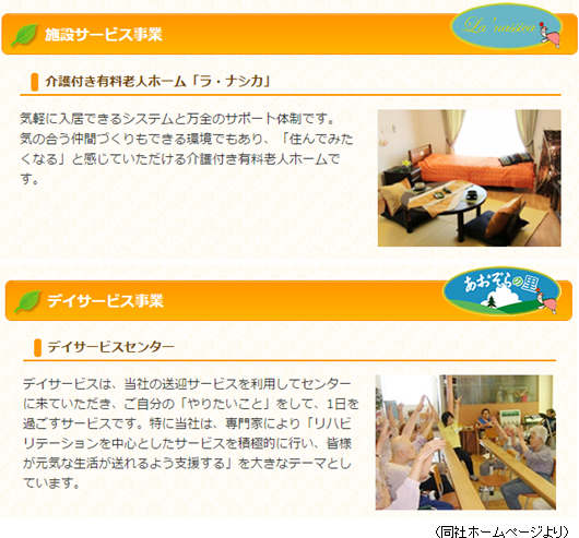 リハビリテーションを重視して、永く、元気でその人らしく、健康に暮らすためのお手伝いをしている。同社におけるリハビリテーションとは、リハビリを頑張れば、将来元気になれる・・・だから頑張るというものではない。今日自分らしく、明日も自分らしく過ごしながら、来月、来年もっと自分自身の力で、自分らしく毎日を過ごす為の準備を行うということを目的としている。 社会参加などを重視しクラブ活動や外出イベントなどを積極的に行っている。 ![]() 【事業セグメント】