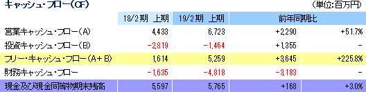 利益の増加と売上債権の回収が進んだ事で前年同期は44億円だった営業CFが67億23百万円に増加する一方、無形固定資産投資やM&A関連費用の減少で投資CFが△28億19百万円から△14億64百万円に減少。フリーCFが52億59百万円と同3.3倍に拡大し、借入金の返済を進めた。