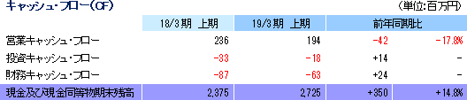 上期末の総資産は前期末との比較で1億26百万円増の36億25百万円。借方では、1億75百万円のフリーCFを確保した事等で現預金が増加した他、契約の積み上がりで立替金も増加。貸方では、純資産等が増加した。自己資本比率72.1%(前期末69.8%)。