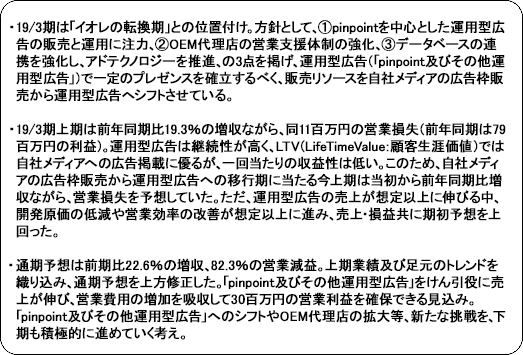 ![]() 「pinpoint及びその他運用型広告」をけん引役に前年同期比19.3%の増収、営業損失ながら期初予想を上回る着地