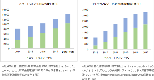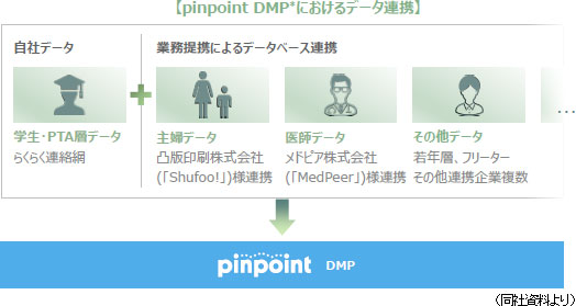 「らくらく連絡網」のデータを蓄積管理するDMPを用いたDSP広告等の広告運用サービスと「Indeed」をはじめとした広告代理・運用サービスを提供している。ネット広告市場では、DSP等のアドテクノロジー広告市場が拡大しており、2017年に3,300億円を超えている(同社資料より)。アドテクノロジーはネット上で特定の個人に的確な広告を配信する技術であり、過去に見たサイトや購買履歴を分析し、0.1秒以内にサイト閲覧者の好みや関心に合わせて最適な広告を端末に配信する。このため、広告ターゲットか否か、を特定する技術の開発競争が激化しており、その際、同社が保有しているような詳細なユーザーデータは大きな強みとなる。 アドテクノロジーを駆使した広告は運用型広告とも呼ばれ、その主流は、複数の媒体やアドネットワークの広告枠を一括で買い付けて配信するDSP(Demand Side Platform)広告。DSP業者のシステムに接続して運用を行い、運用に際しては、的確なターゲット属性への広告配信を実現するため、サイトアクセスログ、購買データ、広告出稿データ等の様々なデータを管理するDMP(Data Management Platform)を活用する。DMPを使う事で、特定ユーザーへの広告配信や属性別の広告配信が可能になり、広告効果を高める事ができる。 同社の強みは、「らくらく連絡網」で蓄積した、性別、生年月日、職業、居住地域、配偶者の有無、子供の有無、大学学部、活動エリア等、670万人を超えるユーザー情報(ビッグデータ)を有する事。このビッグデータを基に独自のDMP「pinpoint」を構築しており、他社が真似のできない高い精度でターゲット層への的確な広告配信を実現している。 ![]() らくらく連絡網