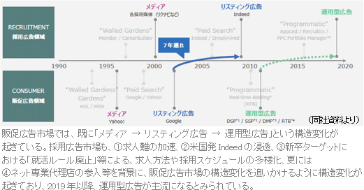 同社は精緻な自社データベースを活用した人材採用広告に強みを持っている。これまではメディア掲載型を中心に人材採用広告事業を展開してきたが、人材採用広告市場は、メディア掲載型広告からSNSや自社HPを活用した運用型広告へシフトしつつあり、今後、運用型広告代理店の参入等による競争激化が予想される。また、運用型広告はLTV(LifeTimeValue:顧客生涯価値)が高く、ストック型のビジネスでもある。このため、同社は競争が激化する前に一定のシェアを確保すると共に、スポット型(メディア掲載型)からストック型への収益モデルの転換を図るべく、運用型広告に軸足を移した。19/3期は、下記3方針に基づき取り組みを進めている。
