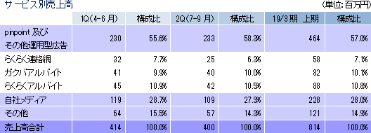 売上高は前年同期比19.3%増の8億14百万円。「pinpoint及びその他運用型広告」の拡大を基本方針に、体制強化とOEM代理店強化に努めた結果、「pinpoint及びその他運用型広告」の売上が前年同期の2億65百万円から4億64百万円に同74.6%増加した。営業損益は11百万円の損失。仕入れが発生する「pinpoint及びその他運用型広告」の売上増で原価率が11.2ポイント上昇し、売上総利益が同5.3%減少した。一方、販管費は、営業戦略の転換に伴う体制の整備で人件費等が増加した他、「らくらくアルバイト」の拡大に伴う費用増や上場維持費等の増加もあり、3億64百万円と同24.3%増加した。 「らくらく連絡網」の上期末の会員数は673万人(前年同期末比0.7%増)、有効団体数は38万団体(同0.4%増)。団体属性は、スポーツ系サークル25.2%、学校教育21.8%、趣味系サークル19.5%、友達・仲間15.7%、ボランティア組織10.1%、仕事関係7.7%。 「ガクバアルバイト」の上期の新規登録者数は8万人(前年同期比19.8%増)、「らくらくアルバイト」の上期末の会員数は142万人(前年同期末比18.6%増)。 ![]() ![]() ![]() |