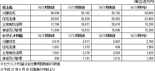 セグメント利益は、中古住宅において良質な物件への入替えを目的に一部低採算物件を積極的に処分したことに加え、利益率の高い新築建売住宅が減少したことにより住宅流通事業で減少した他、前年同期に大型個人投資家向け一棟売マンショ ンの引渡しがあった反動により土地有効活用事業も減少した。その一方で、自由設計住宅の引渡戸数が増加したことにより分譲住宅事業で増加した。