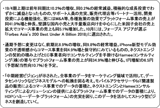 コマース事業は、国内売上が横ばいにとどまるものの、海外の増加で吸収する。国内は小売・卸売共に前18/4期下期におけるiPhoneXの動向を反映した。iFaceシリーズについては、旧モデル向けを含むラインナップの充実及びガラスフィルム等関連商品への展開で足元は好調。保守的な予想にとどめたため、今秋発売予定の新型iPhone商戦の動向次第では、大幅に上振れする可能性がある。