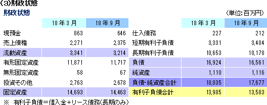 売上高は前年同期比5.3%減の4億14百万円、セグメント損失は51百万円(前年同期は30百万円の損失)。利益率の改善のため人員配置や業務手順の見直し等、効率的な運営に取り組むことに注力した。減収により23百万円、介護人件費増により1百万円の減益要因。その他事業は、売上高が前年同期比85.5%増の2億31百万円、セグメント利益は同121.6%増の29百万円となった。また、全社経費(表中の連結調整)が82百万円増加しているが、これは人件費65百万円増等事業規模の拡大に伴う全社費用の増加によるもの。 ![]() 流動負債は前期末比90百万円増加し50億58百万円となった。主な要因は、短期借入金が45百万円、賞与引当金が36百万円増加したことによるもの。固定負債は前期末比4億53百万円減少し115億2百万円となった。主な要因は、長期借入金が3億94百万円減少したことによるもの。純資産は、前期末比5百万円増加し11億16百万円となった。主な要因は、利益剰余金が4百万円増加したことによるもの。これらにより、上期末の総資産は、前期末比3億57百万円減少し、176億77百万円となった。 自己資本比率は前期末比0.1ポイント上昇し、6.3%となった。 ![]() 営業CFは、前年同期比1億51百万円収入が減少し、3億86百万千円となった。主な内訳は、収入要因として、税金等調整前四半期純利益1億3百万円、減価償却費3億2百万円、支出要因として、売上債権の増加額1億3百万円であった。 投資CFは、前年同期比1億58百万円支出が減少し、1億58百万円の支出となった。主な内訳は、支出要因として、有形固定資産の取得による支出1億40百万円、預り保証金の返還による支出45百万千円、収入要因として、預り保証金の受入による収入47百万円であった。 これらにより、フリー・キャッシュ・フローは前年同期比6百万円収入が増加し、2億27百万円の収入となった。 財務CFは前年同期比3億58百万円支出が増加し、4億43百万円の支出となった。主な内訳は、支出要因として、短期借入金の返済による支出10億40百万円、長期借入金の返済による支出3億65百万円、収入要因として、短期借入れによる収入10億85百万円であった。 |