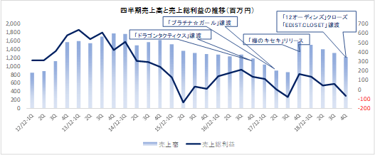 2010年11月にサービスを開始し、18/12期末で8年1ヶ月経過した。会員数は130万人。18/12期第4四半期は、アップデートに伴い「変身アイテム」を追加した効果や8周年記念の復刻ガチャの好調で前四半期比増収となった。コラボを推進すると共に、魅力的なアイテムを提供する事でユーザー満足度を高めていく。
