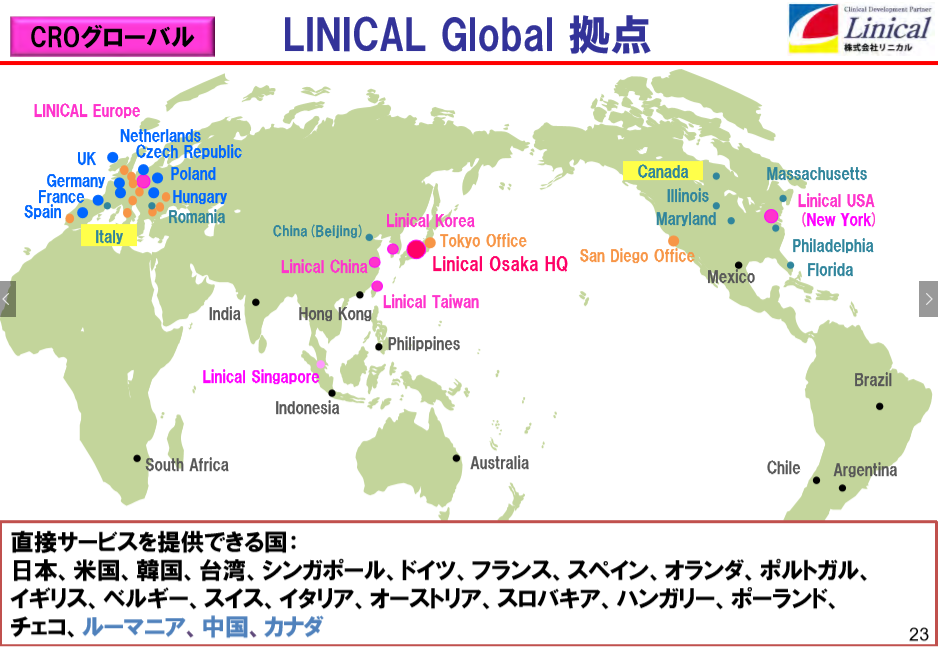 SMO(治験施設支援機関)事業進出を念頭に、06年1月に同事業を手掛けるアウローラ(株)を子会社化したが、CRO事業への経営資源集中を図るべく07年5月に全保有株式を売却。08年7月に、国内の製薬会社の米国進出支援を目的に米国カリフォルニア州に全額出資子会社LINICAL USA, INC.を設立。同年10月の東証マザーズ上場を経て、13年3月に東証1部に市場変更となった。13年5月に、台湾と韓国に全額出資子会社LINICAL TAIWAN CO.,LTD.とLINICAL KOREA CO.,LTD.を設立。14年4月には、LINICAL KOREA CO.,LTD.と買収した韓国のCROであるP-pro. Korea Co., Ltd.との統合を完了した。14年10月29日には欧州でCRO事業を展開しているNuvisan CDD Holding GmbHの全株式を取得し子会社化するための株式譲渡契約を、Nuvisan Pharma Holding GmbH との間で締結し、12月1日付けで同社の100%子会社となった。更に、グループとしての一体感の醸成と連携強化を図るため、連結子会社となったNuvisan CDD Germany GmbHの名称をLINICAL Europe GmbHに商号変更した。その他、16年3月にLINICAL U.K. LTD.を、同年10月にLINICAL POLAND sp.z.o.o.を、17年9月にLINICAL Czech Republic s.r.oを 設立した。また、2018年4月に米国でAccelovance,Inc.を買収し、Lnical Accelovance America,Inc.に社名変更。その他、19年3月にLINICAL Hungaryを設立、19年5月にLINICAL CHINA設立を。国際共同試験の受託体制が更に強化された。