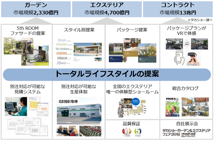 ガーデン(庭)に加えて、エクステリア、コントラクトにおける市場を主軸とし、それぞれの新築、リフォーム、リノベーションへの製品を投入する。