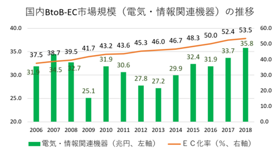 - 前回のレポートでも述べたように、株取引の世界ではインターネット取引が圧倒的な主役となったと同様、現在はまだまだ小規模なプリント基板のEコマースであるが、電気・情報関連機器製造業のEC化率は53.5%と既に5割を超えていることからも、今後のメインストリームとなる可能性は大きいと思われる。