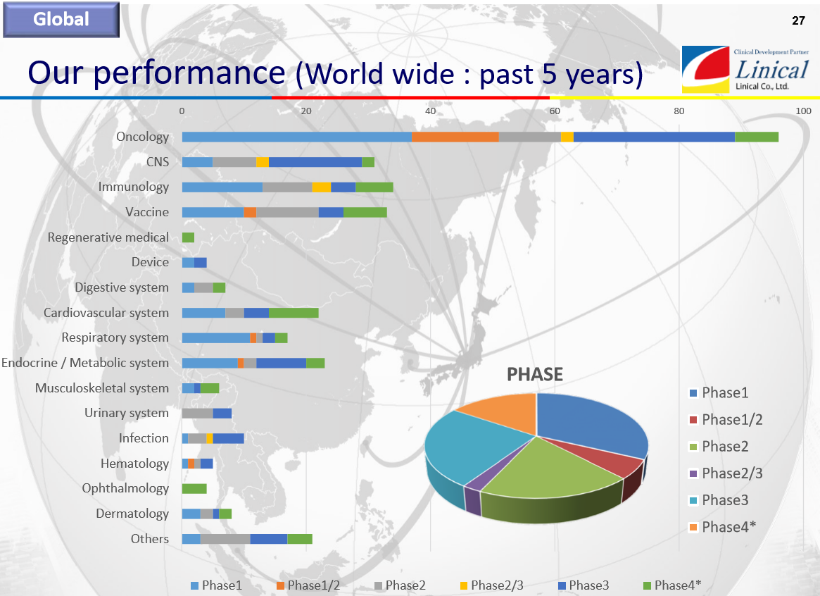 主力のCRO事業においては、事業特化型CROに特徴がある。新薬の迅速な市場投入につながる高品質で高効率な治験の支援を目指して、高い技術と豊富な経験をもつスタッフが担当にあたっている。今後も拡大するグローバルスタディに対応していくため、アジア(韓国、台湾、シンガポール、中国など)と欧州、米国に拠点を開設。薬事から企画、実施計画書の作成、モニタリング、データマネージメント、統計解析、ファーマコビジランスまでワンストップで対応。国際共同治験においては、リニカル本社を窓口に位置づけ、各国に医薬品開発事情に精通した人材を配置。日本語ベースで機動的な国際共同治験が可能な開発環境を整えている。10年から20年近くに及ぶ新薬開発プロジェクトの中でも、3年から7年を要するといわれる治験で特に重要とされる患者を対象とする「第Ⅱ相(フェーズⅡ試験)」「第Ⅲ相(フェーズⅢ試験)」のプロセスに特化し、受託特化型の事業形態にて治験の核となる「モニタリング」を「品質管理」「コンサルティング」とともに提供。信頼性の高いデータの収集を行い、迅速、確実な新薬開発の実現を支援している。更に、豊富な医薬品開発情報を有する大手製薬会社に特化すると共に、担当領域も市場からの開発要請の強いがん領域や中枢神経系領域をはじめ難易度の高い領域に特化することで、顧客である製薬会社のニーズに応えている。