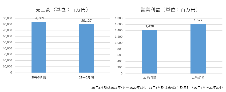 20年4月~21年3月の12か月間売上高は前期(20年3月期)比42億円減収の801億円。