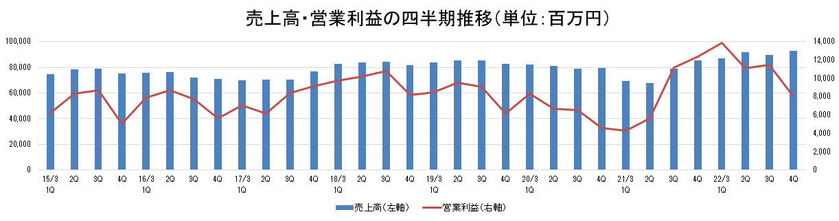 - 22年3月期の売上高は前期比19.8%増収の3,617億円、営業利益は同33.0%増の444億円。エラストマー素材事業は、海上運賃高騰、修繕関連費用等が増加したものの、主原料価格上昇に伴う販売価格改定が進み増収増益。輸出コンテナ不足や船繰りの影響で欧米向け中心に出荷に遅れが生じている。主原料である国産ナフサは引き続き上昇基調にある。アジアブタジエンも第3四半期下落したが、年度末にかけて再び上昇した。高機能材料事業は、半導体不足等の影響はあったが増収増益。高機能材料の需要は総じて堅調に推移した。売上・利益とも、期初予想を上回り、ほぼ2022年1月31日に公表された修正予想通りの着地となった。