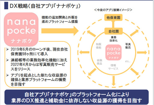 | DX戦略 | ➢自社アプリ「ナナポケ」の開発を推進 ➢業界のDX推進と補助金以外の収益の柱を確保 |