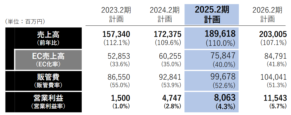 - 「ECの飛躍的拡大」「収益力の強化」「新たな体験価値のクリエーション」「成長事業領域への投資」を積極的に進め、2025年2月期、売上高1,896億円、営業利益80億円、売上高営業利益率4.3%を計画している。翌期26年2月期には売上高2,000億円超えを掲げている。また、EBITDA9%以上、ROE5.3%以上、EC化率40%以上も目標としている。