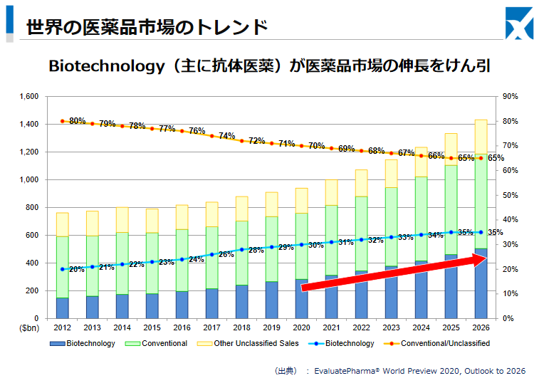 同社資料における記述(出典:Evaluate Pharma®の「Evaluate World Preview 2020,Outlook to 2026」)によれば、医薬品の総売上高に占めるバイオ医薬品の構成比は2020年の30%から2026年には35%まで上昇すると予測されている。