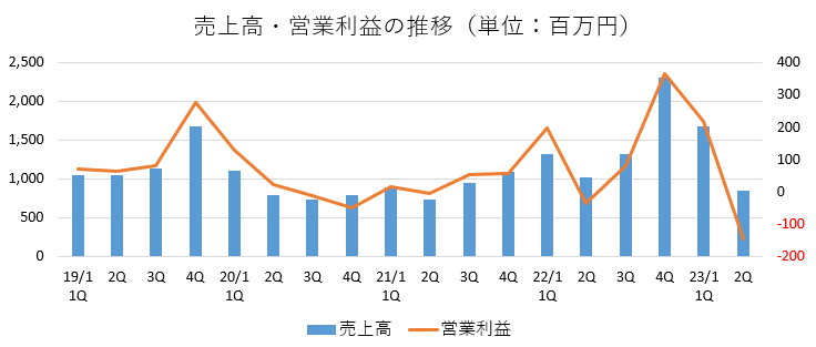 - 23年1月期第2四半期の売上高は前年同期比8.5%増の25億33百万円。前期から施工を開始した大型の解体工事が順調に進捗し、グループ化した株式会社矢澤の再開発物件等における環境対策工事の受注・着工も好調だった。営業利益は同53.4%減の75百万円。増収も一部工事で低利益率の受注があり売上総利益は前年同期水準となった一方で、継続的な人材採用・研究開発・広告宣伝等の投資による販管費の増加を吸収できなかった。四半期ベースでは2四半期連続の前四半期比減収減益。