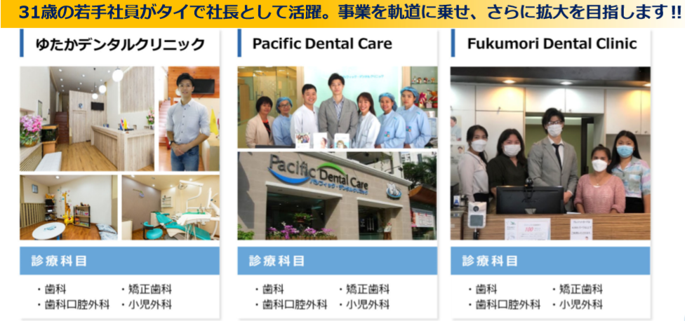 医療機関経営支援事業 | ・新規チャネル開拓と収益モデル構築 ・歯科医院の開業・経営に対する多チャンネルでの支援から歯科医師個人のライフサポートまで総合的に支援 ・セミナー、大学及びスタディグループの開業支援及び経営支援案件の掘り起こし ・歯科ディーラー事業を拡大 ・医薬品・医薬部外品の販売 ・タイでの歯科事業の拡大 |
