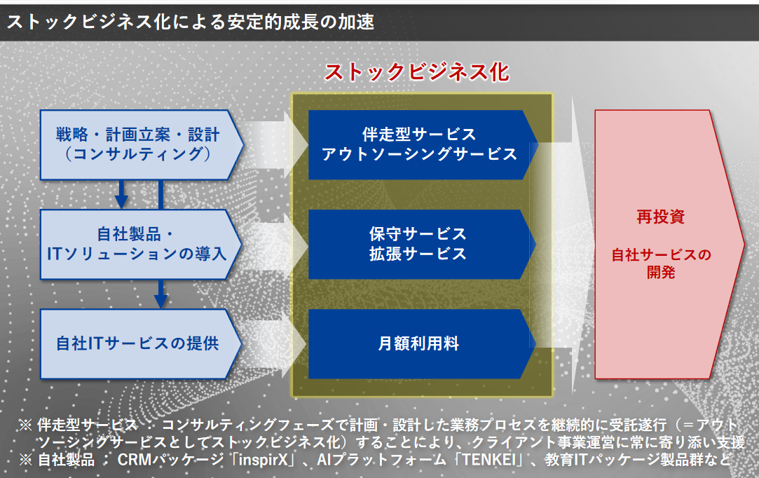 具体的なサービス内容は、「コンサルティングサービス」「CRM製品提供」「ストック型ITサービス」からなる。