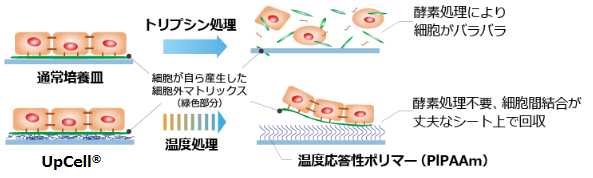 現在、一般的に使用される細胞回収技術であるタンパク質分解酵素の利用においては、細胞はダメージを受けた状態で回収され、細胞が有する本来の機能、成分を完全に維持する事が困難だが、同社の温度応答性細胞培養器材製品を導入する事により細胞を無傷で回収する事が可能となる。