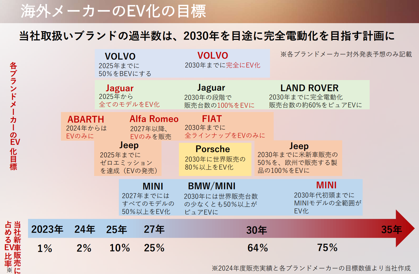 輸入車メーカーは、環境課題への対応に積極的で、同社取り扱いブランドの過半数は、2030年を目途に完全電動化を目指す計画を発表している。