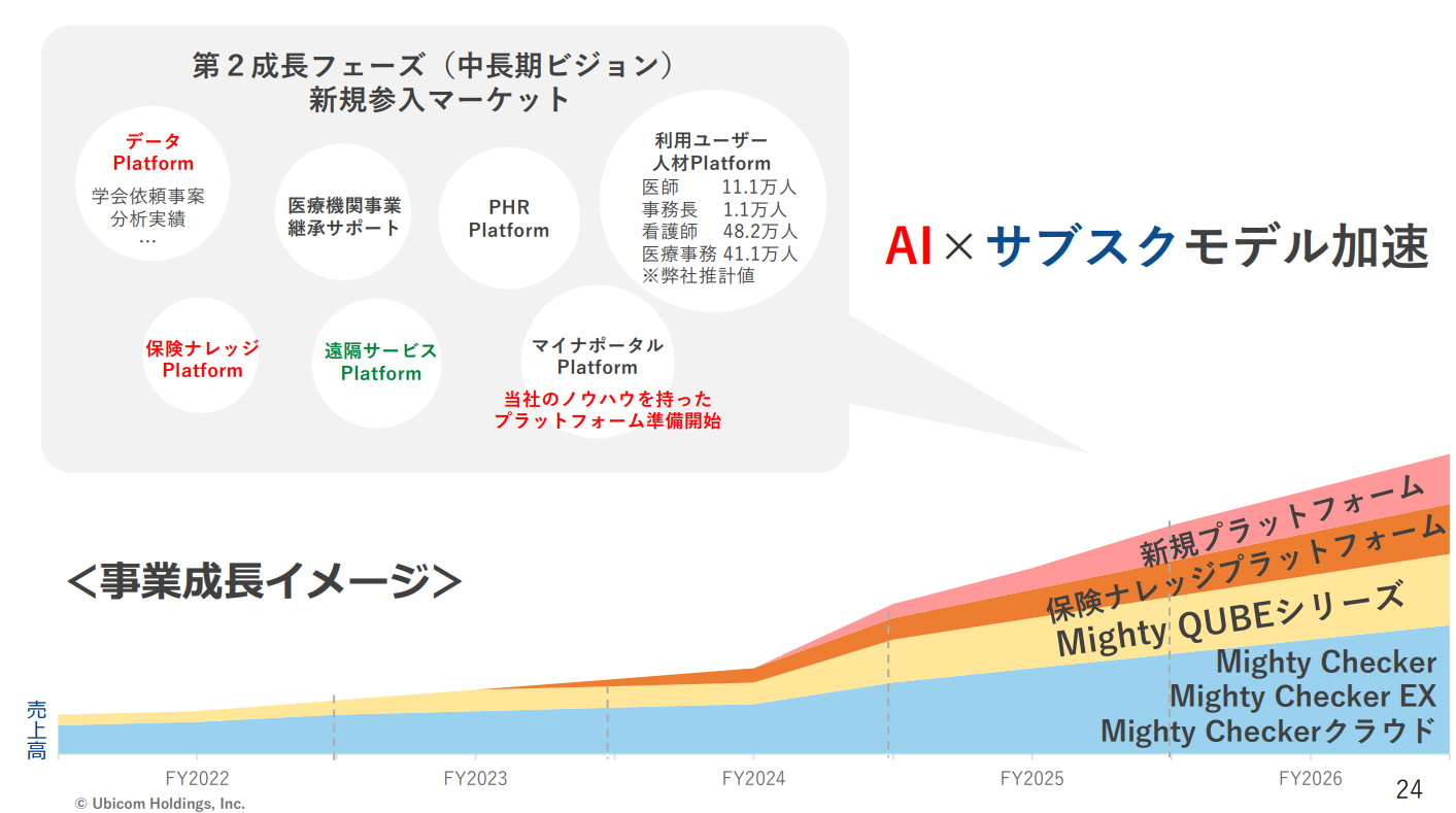 20,000を超える医療機関の顧客基盤、自社製の医療データベース、知的財産を活用して、MightyChecker® EX、MightyQUBE® Hybrid、MightyChecker® Cloudが安定収益を生み出している同社は、今後、第2成長フェーズとして、保険ナレッジ、データヘルス、遠隔サービス、マイナポータル、利用ユーザー人材プラットフォームなどを対象とした新規プラットフォームビジネスを推進する。その先駆けとして、「遠隔サービスプラットフォーム」の準備を開始した。