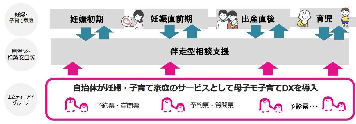 引き続き、保護者・自治体・医療機関3者間のデータ連携を推進し、乳幼児健診、小児予防接種、質問予約票入力、予約機能などをシームレスに進め、「子育てDX」を実現する。
