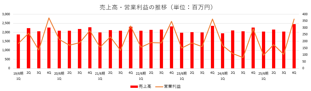 - 25年6月期の売上高は前期比3.9%増の86億95百万円。営業利益は同13.6%増の7億42百万円。売上総利益が同2.9%増加した一方、租税公課の減少などで販管費は同2.3%減少し、2桁の増益となった。当期純利益は同87.1%減の2億29百万円。前期に発生した投資有価証券売却益がなくなったことに加え、社宅アウトソーシングサービスの社内基幹システム開発において現行の開発プランの継続中止を決定したことから、特別損失に固定資産除却損等を計上した。年間配当は業績のほか経営環境や今後の事業展開等を総合的に勘案して、前期比2円/株増配の41 円/株とした。