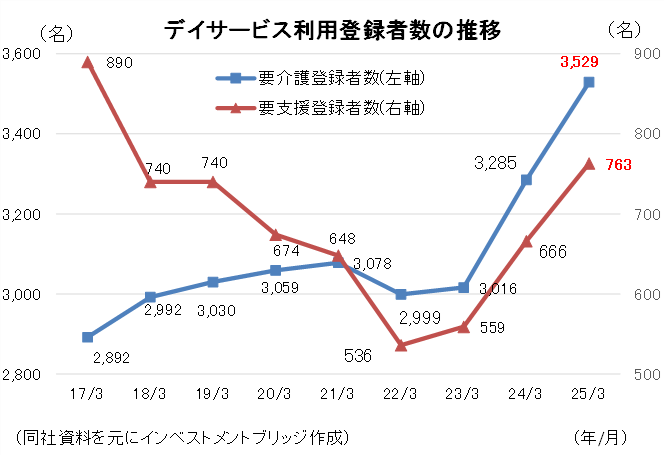 事業は、同社の施設の来場者にサービスを提供するデイサービス事業、有料老人ホーム等の施設の入居者を対象にサービスを提供する施設サービス事業、及び利用者の自宅を訪問して日常生活訓練や機能訓練等を行うリハビリサービスや日常生活の手伝いを行うホームヘルパーサービス等の介護サービスを提供する在宅サービス事業に分かれる。25/3期の売上構成比は、(内部売上高を除く)は、それぞれ21.9%、71.1%、6.5%。また、その他事業として、福祉用具事業、障害支援事業及び給食事業を展開する(25/3期の売上構成比は0.5%)。