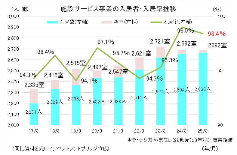 施設サービス事業は同社の収益を支える屋台骨となっている。入居率は25年3月現在98.4%と高い稼働率。
