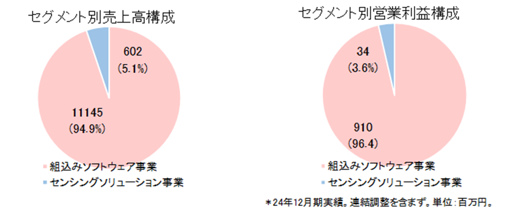 組込みソフトウェア事業を主体に、組込みソフトウェア事業およびセンシングソリューション事業の2つの事業セグメントを展開している。グループは同社および、連結子会社(イーソルトリニティ株式会社、eSOL Europe S.A.S.)2社から構成されている。なお、8月にKMCホールディングスを子会社化しており25/12期4Q以降の連結子会社は3社になる。