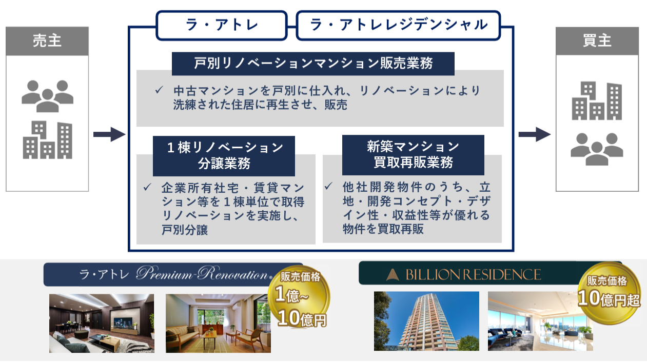 主力である戸別リノベーションマンション販売に注力し、1戸当たり1億円以上の「ラ・アトレ Premium-Renovation®」シリーズを中心として、1戸当たり10億円以上のハイグレードな邸宅「BILLION RESIDENCE®」を展開。幅広い顧客層のニーズに対応した商品に加えて企画・デザイン力により、価格競争に巻き込まれることのない競争優位性の高い高付加価値の商品を供給し独自のポジションを確立する。