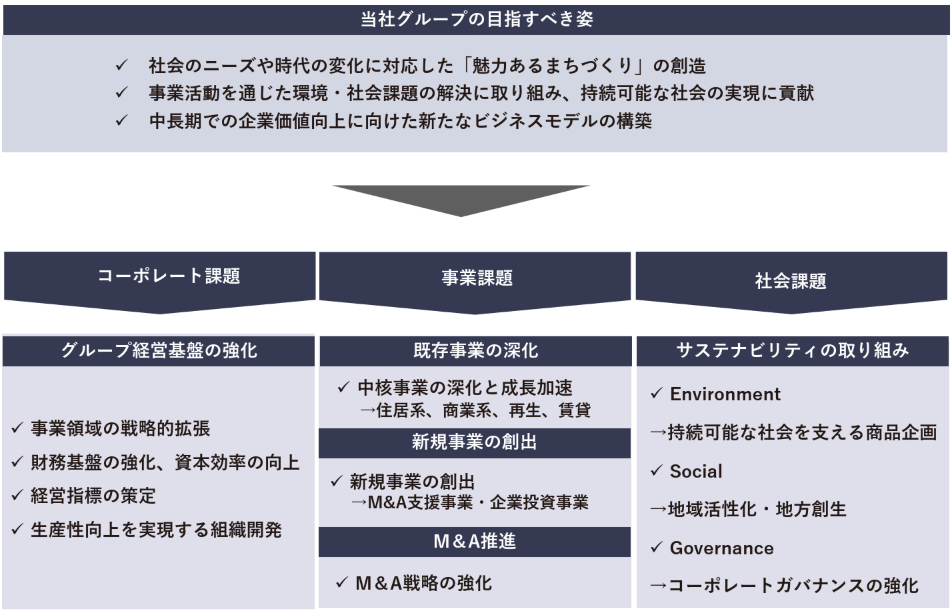 成長ドライバーとなる収益不動産開発では、商業系の商業ビル「A*G」シリーズ及びオフィスビル「THE EDGE」、住居系の高級賃貸レジデンス「THE DOORS」シリーズを積極的に展開し、競争優位性のある商品企画により更なる高付加価値化を追求するとともに、ブランド力向上と地方主要都市へのエリア拡大を図る。また、分譲マンション事業においては、「ラ・アトレレジデンス」ブランドを地方主要都市に展開するとともに、沖縄県において「レーヴ」シリーズのブランド事業拡大を図り、事業基盤の強化と競争優位性が発揮できる独自のポジションを確立する。