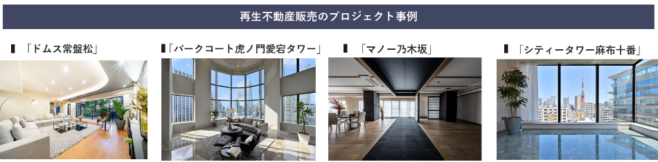 ①戸別リノベーションマンション販売業務 | 中古マンションを戸別に仕入れ、リノベーション内容の企画・立案などにより洗練された住居として再生を図り、一般顧客等へ販売する。物件の仕入は、立地、価格、規模等を吟味・厳選して、仲介・流通不動産業者、サービサー、金融機関を通じた債権処理の情報等を活用して戸別に買い取る。 高価格帯のプレミアム領域に注力し、中古マンションに対して新築同様の内装・設備等を施し、他にはない立地の希少性と洗練された居住空間に仕上げ、同じ条件の新築物件よりもリーズナブルな価格で魅力的な商品を提供している。 |