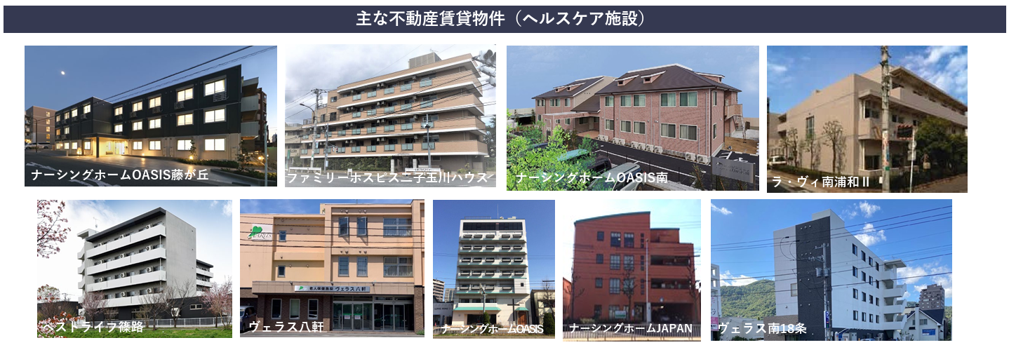 固定資産として保有する不動産を賃貸することで、安定的な収益を確保する。社会的ニーズの高いヘルスケア施設を中心として、レジデンシャルホテル、商業施設等を建設又は取得し、運営事業者等へ1棟で賃貸している。
