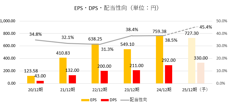 配当は前期比38円/株増配の330.00円/株の予定。予想配当性向は45.3%。