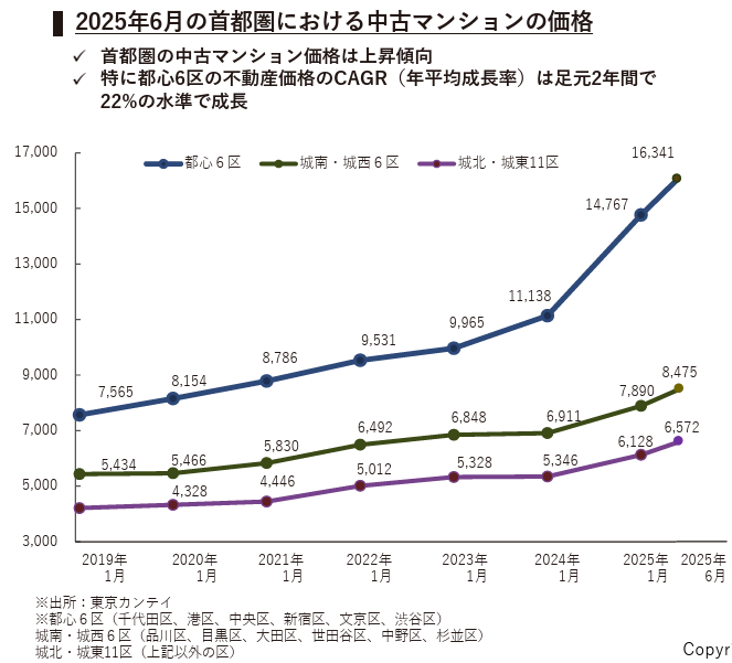 都心6区における中古マンションの価格は、2019年以降堅調に上昇しており、2025年度は、前年比+33%と大幅に上昇。周辺エリアとの価格差が拡大している。