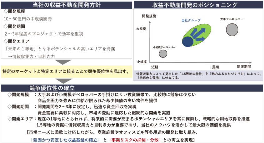 開発エリアについても、「未来の一等地」となるポテンシャルの高いエリアを発掘することに注力しており、それを可能にする情報収集力や目利き力に大きなアドバンテージを有している。