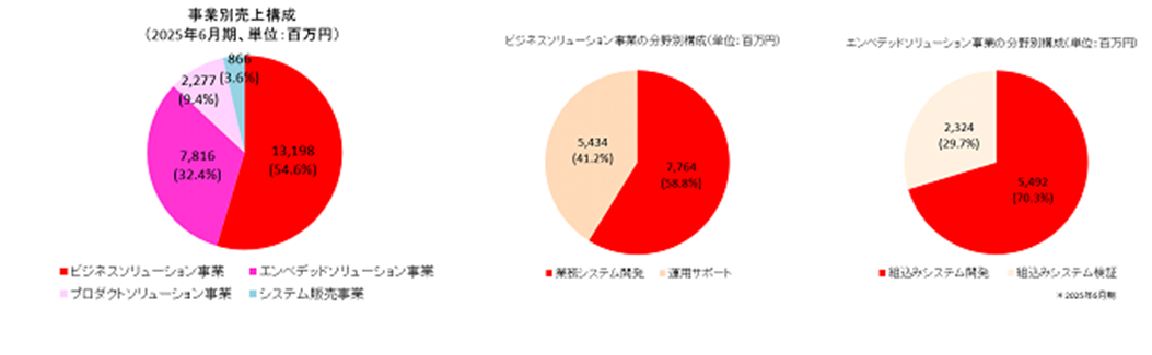 ビジネスソリューション事業は業務システム開発と運用サポートで、エンベデッドソリューション事業は組込みシステム開発と組込みシステム検証で構成されている。