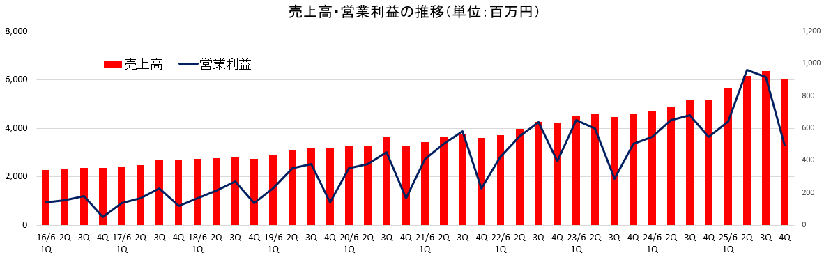 - 25年6月期の売上高は前期比21.5%増の241億59百万円。ソフトウェア開発事業、システム販売事業ともに2桁増収。M&Aした子会社の寄与もあり、プロダクトソリューション事業は倍増以上と大きく伸長。営業利益は同24.3%増の30億13百万円。増収に伴い売上総利益は同24.3%増加し、前々期発生した不採算案件の対応完了による反動や案件単価向上、自社製品販売増加もあり粗利率も同0.5ポイント改善。社員の処遇改善、M&Aののれん償却など事業規模拡大に伴う費用も増加したがこれを吸収し2桁の増益。売上・利益とも15期連続の増収増益で過去最高を更新。上方修正後の業績予想も上回った