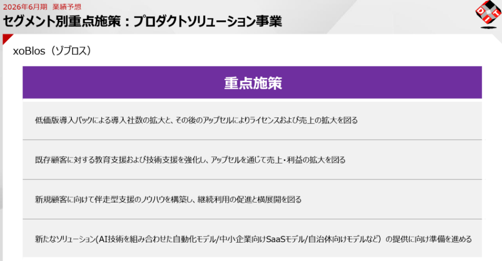 「xoBlos」については、大手企業を中心に導入社数を増やし、サブスクリプションライセンスフィーの拡大を目指す。