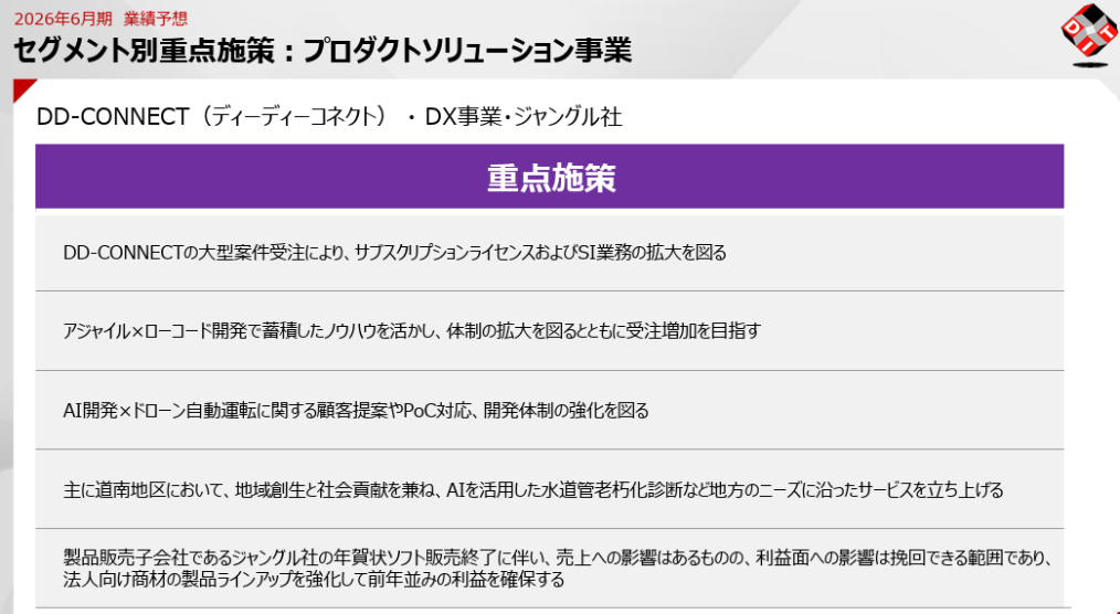 「DD-CONNECT」は、導入実績のある建設業界や不動産業界を中心に大型SI案件を獲得し、サブスクリプションライセンスのストックの大幅な伸びを目指すほか、地方自治体への展開も推進する。