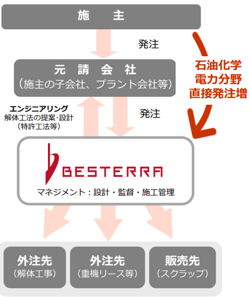 解体・メンテナンス事業は、製鉄・電力・ガス・石油等あらゆるプラントの解体工事の展開が主軸。工法の提案、設計、施工計画、外注・資機材手配、施工管理、安全管理、原価管理、資金管理及び行政対応等のエンジニアリング全般を提供している。同社自身は、独自の解体技術の設計、施工計画に基づいた工事の管理監督に専念し、施工は専門の外注先を利用している。プラント解体工事は、製鉄・電力・ガス・石油等のプラントを有する大手企業が施主であり、多くの場合、施主系列のエンジニアリング子会社あるいは大手ゼネコンが工事を元請けし、同社が一次下請け、二次下請けとなっている。