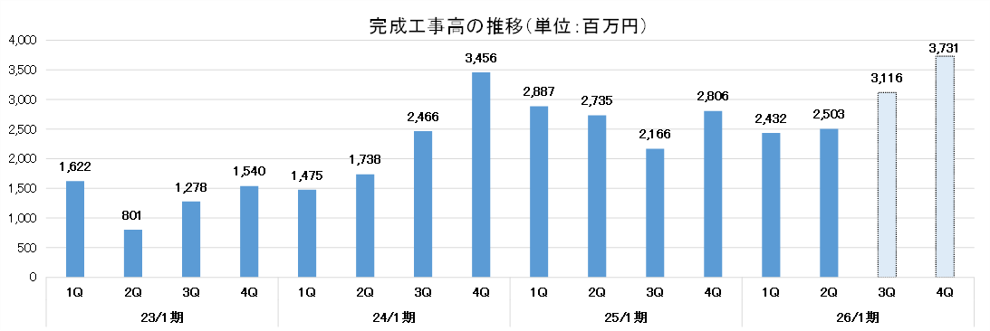 工事契約における収益の計上基準には、工事が完成した時に収益を計上する完成基準と工事の進捗に応じて収益を計上する進行基準がある。同社においては、工事期間3ヶ月超の大型工事について、23/1期以降、原則として工事進行基準を適用している(上記に該当しない工事は完成基準を適用)。完成基準適用工事の収益計上(完工)時期は顧客(施主)の設備投資計画の影響を受ける事が多く、同社の場合、第1四半期(2-4月)と第4四半期(11-1月) に収益が計上される割合が高い(収益計上の季節性)。しかし、四半期業績の変動が投資家のミスリードにつながる可能性があるため、同社は工事進行基準の適用範囲を段階的に広げており、収益計上の平準化に継続的に取り組んでいる。
