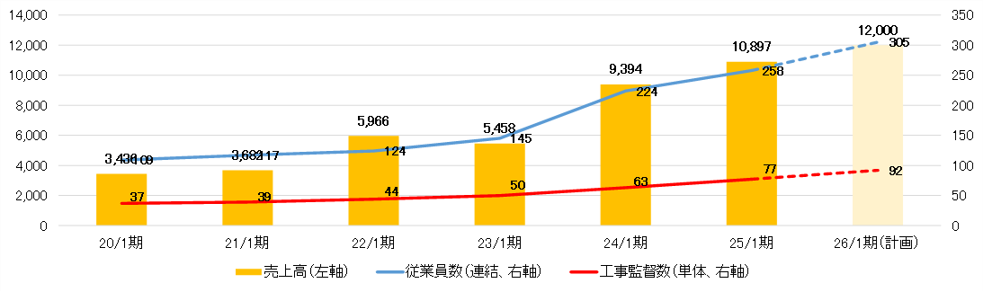 中間期は工事の中断や追加工事に伴う原価の先行計上により会社予想を下回り、26/1期予想は減額修正となった。それでも23/1期をボトムとした売上成長と利益の改善傾向は進んでいる。遅れは見られているものの、利益率向上への課題である営業・積算体制の強化は着実に進んでいる模様。また、25/1期はグループ会社が苦戦したが、子会社2社を譲渡してコア事業に集中し、利益を重視する姿勢はより強くなっている。本田社長のインタビューを通じてもその手応えを得ていると感じた。27/1期を見据えると、昨年から継続している低採算案件がなくなる。こうしたこともあり、営業利益率は26/1期予想5.8%から8.5%へ大幅に改善する見通し。31/3期計画達成への道筋がしっかりと見えてきそうだ。23年に就任した本田社長は様々な種蒔きを行ってきたが、その成果がしっかり現れようとしている。