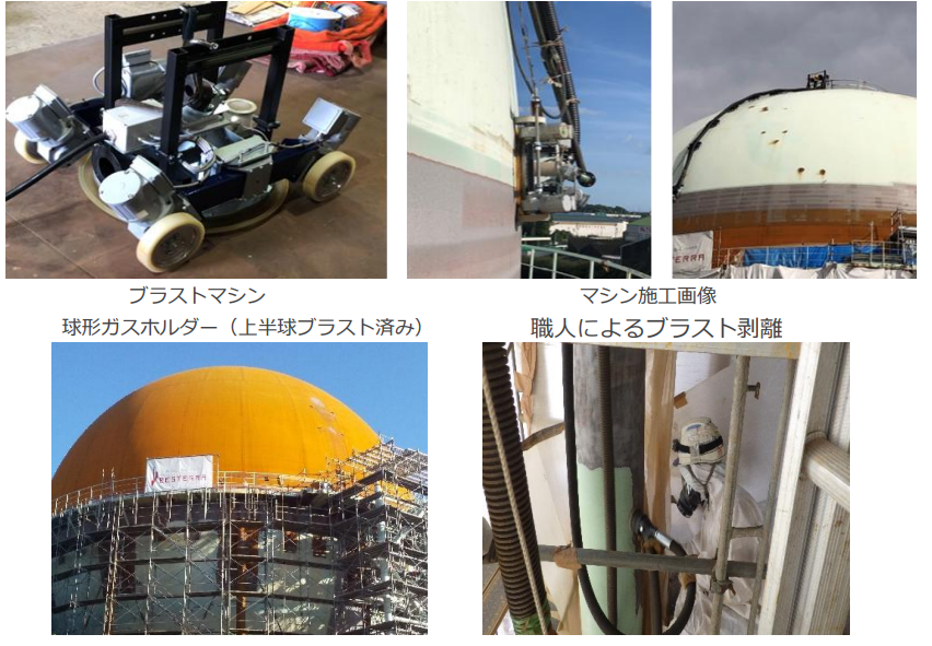 「リンゴ皮むき工法」とは、ガスホルダーや石油タンク等の大型球形貯槽の解体において、リンゴの皮をむいていくように、外郭天井部の中心から渦巻状に切断する工法。切断された部分は重力に従って、渦巻きを描きながら徐々に地上に落ちていく。工期、コスト、安全性に優れ、競合優位性の高い工法であり、「より早く、より安く、より安全に」を実現する。また、この工法を自動化する溶断ロボット「りんご☆スター」も提供している(「りんご☆スター」については、新アタッチメント開発による用途拡大にも取り組んでいる)。
