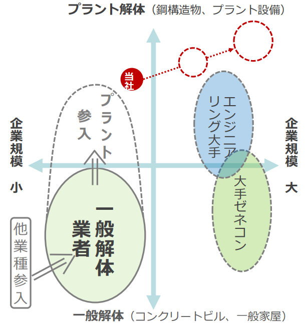 プラント解体市場は今後、年間7,000億円~1兆円で徐々に成長していく見通しです。高いシェアを持つ企業はなく、上場会社で競合するのはイボキン(5699)くらいでしょうか。因みに解体を専業としているTANAKEN(1450)はプラントの解体は一切行っておらず、まったく競合しません。シェアが高い企業がないこともあり競合は案件によってバラバラなのが実情です。解体工事業界はスピンアウトする例が多く見られ、成長を目指している企業は当社とTANAKENぐらいではないでしょうか。