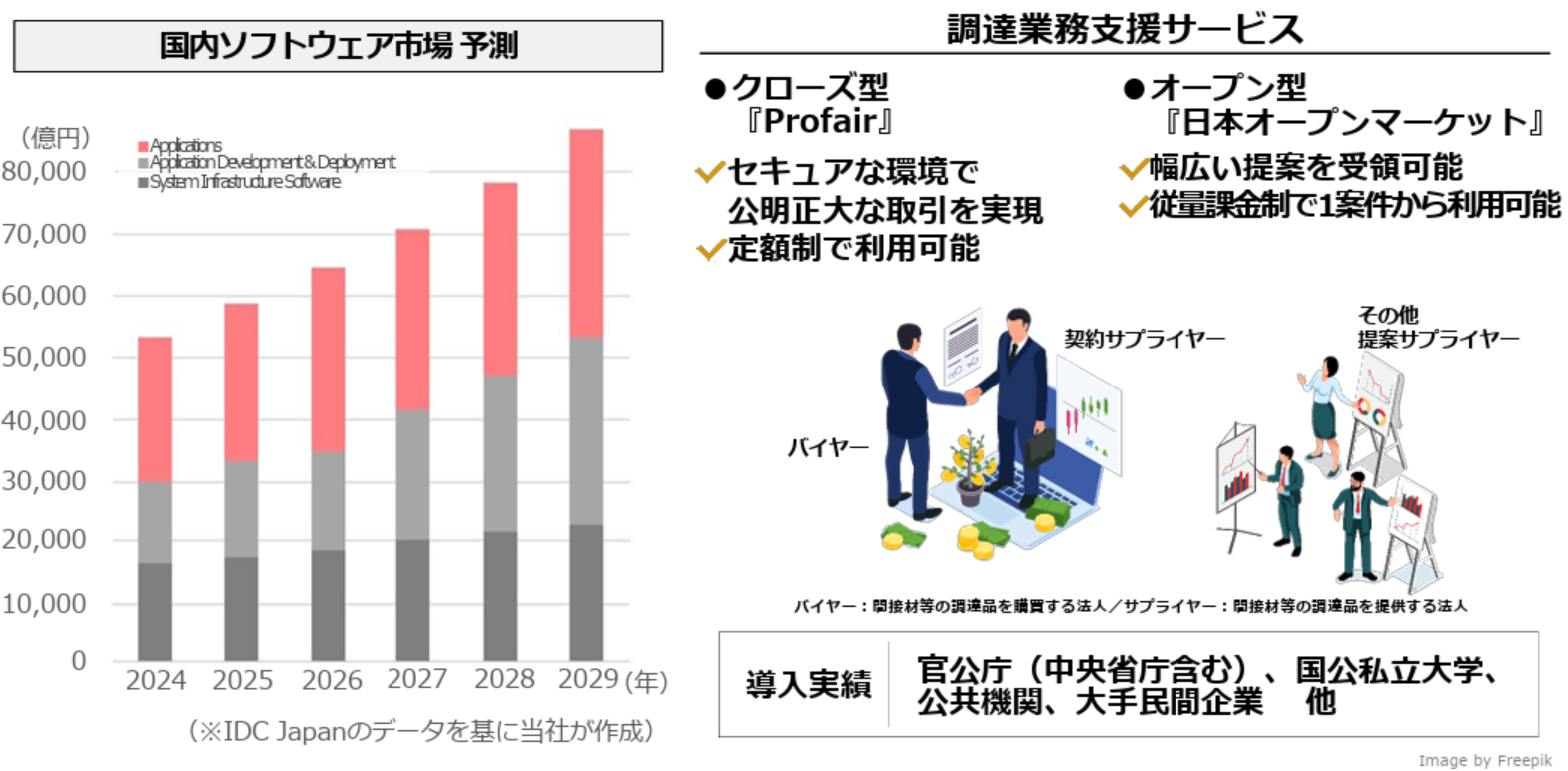 | EC・ASPサービス等 | 調達業務を効率化する調達業務支援サービスは、各種入札機能により、顧客のコスト削減や業務効率化、公平な取引を実現する。クローズ型『Profair』は定額制で、契約サプライヤーのみが応札できるセキュアな環境で公明正大な取引を実現する。オープン型『日本オープンマーケット』は、幅広い提案を受領することができ、従量課金制で1案件から利用が可能である。官公庁や国公私立大学、公共機関、大手民間企業等への導入実績を誇る。 このほか、自治体向けの観光振興アプリや、社員研修を実施・管理するeラーニング等を提供しているほか、東京魚市場卸協同組合(仲卸)等と連携を図り水産物や青果を販売するエスクローサービスも提供している。 |