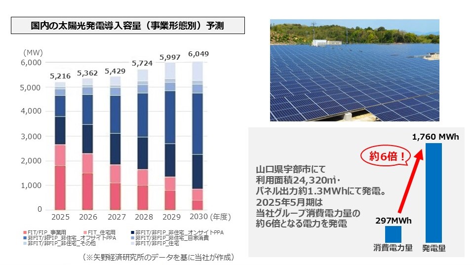 山口県宇部市の太陽光発電設備においては、25年5月期、同社グループの消費電力量の約6倍の電力を発電した。