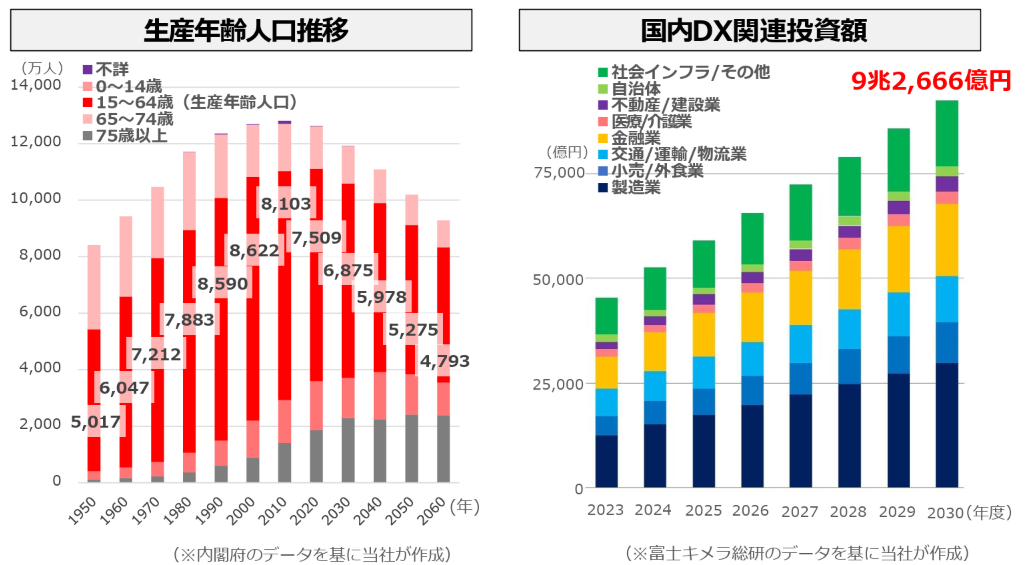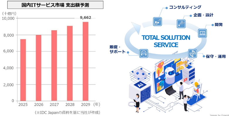 生産年齢人口の減少とそれに伴う国内市場の縮小により、持続可能な社会構築が一層重視され、DX国内市場は2030年に9兆円超まで拡大すると見込まれている。このような状況下、様々なITサービスを通して顧客に新しい価値を提供するとともに社業を通じて社会貢献していく事を目指している同社は、既存サービスの強化はもちろん、新サービスの創出を積極的に推進していく考えだ。
